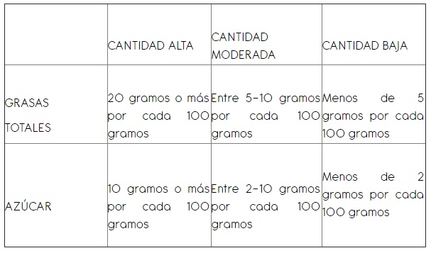 Es por todo esto, que debemos prestar atención a las etiquetas de nutrición a la hora de comprar productos “sanos” como distintos tipos de yogur, barritas energéticas, cereales, bebidas o los 0% materia grasa. En la siguiente tabla, aparecen las cantidades de grasas y azúcar clasificas según su proporción cada 100 gramos: