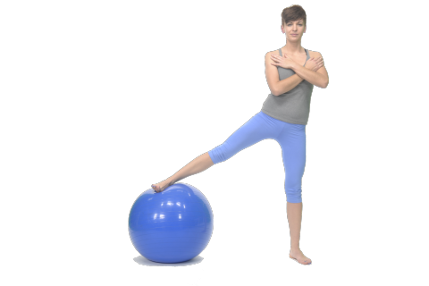Este ejercicio, tiene como objetivo, la mejora de la coordinación de las cinturas pélvica y escapular, el control motor de la rodilla y la tonificación del cuádriceps. La posición de partida del ejercicio, es de pie, con una de las piernas apoyada sobre el fitball. La realización del ejercicio, consta de una flexión de cadera y rodilla y un trabajo coordinado con los brazos. Es muy importante la correcta alineación de la rodilla con el pie para trabajar la estabilización de la misma.