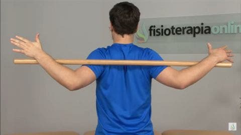 Para este ejercicio necesitarás de un palo como herramienta extra, es un ejercicio para estirar músculos como el pectoral mayor. Para ello colocamos el palo justo detrás de nuestra espalda para mantener una posición erguida e intentaremos pegar o juntar las escápulas, llevando los hombros hacia atrás como puedes ver a continuación.