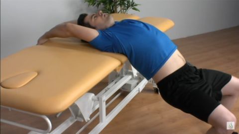 Aquí deberás recostar en una superficie horizontal tu espalda hasta el nivel de las escápulas, el resto del cuerpo queda por fuera, si estás apoyado sobre una mesa puedes colocar una almohada para que el borde de la superficie no moleste, luego te sujetas bien a la superficie, respiras profundo y dejas caer el cuerpo, buscando cada vez una mayor amplitud, en esta postura sentirás cómo se endereza tu espalda y tus músculos pectorales y dorsales se estiran.